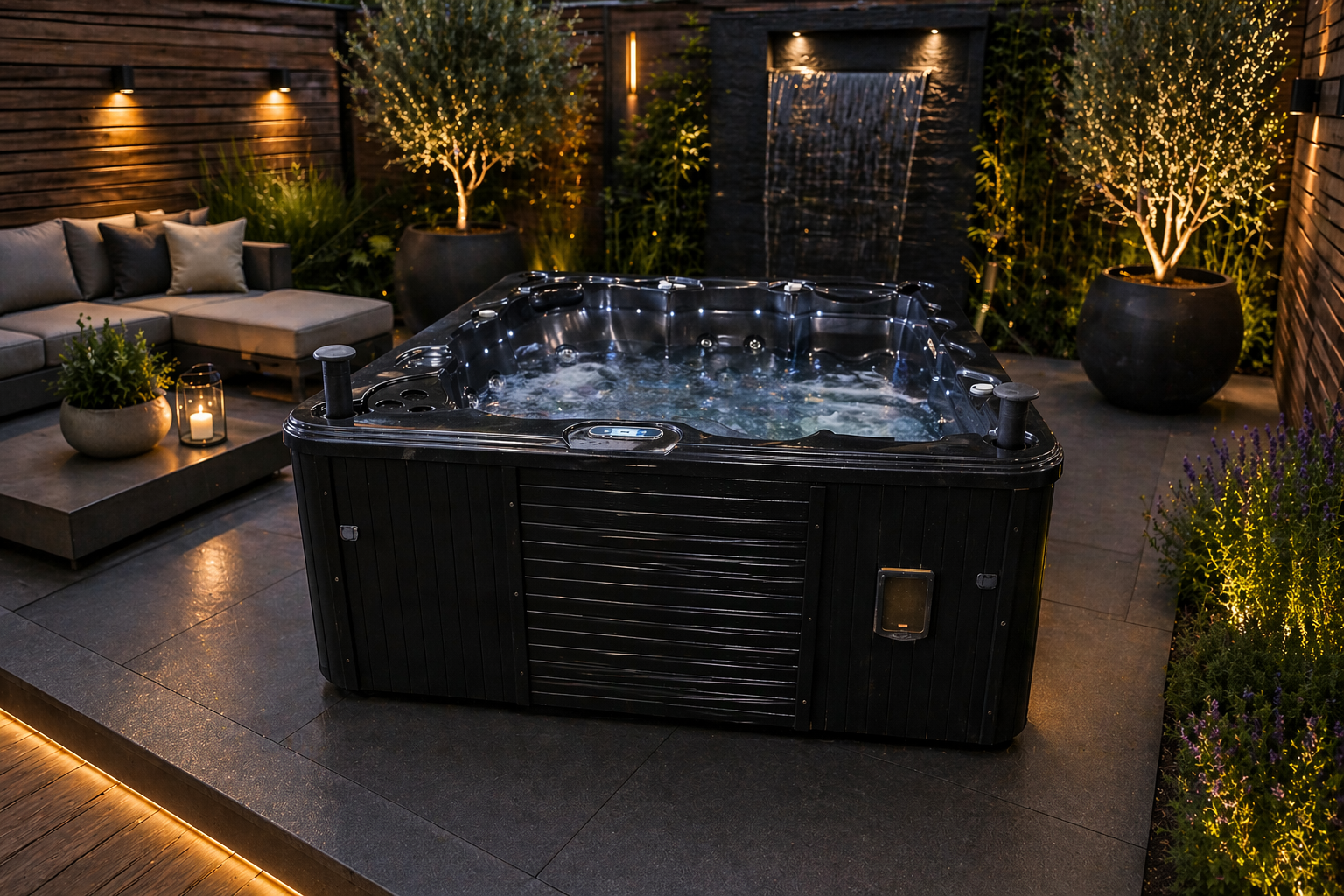 De jacuzzi biedt plaats aan 5 personen en beschikt over 1 comfortabele ligplaats. Daarnaast is deze uitgevoerd met een interne trap, wat het in- en uitstappen extra makkelijk maakt. De combinatie van sfeervolle verlichting, een waterval en verstelbare jets zorgt voor een heerlijke wellnessbeleving.